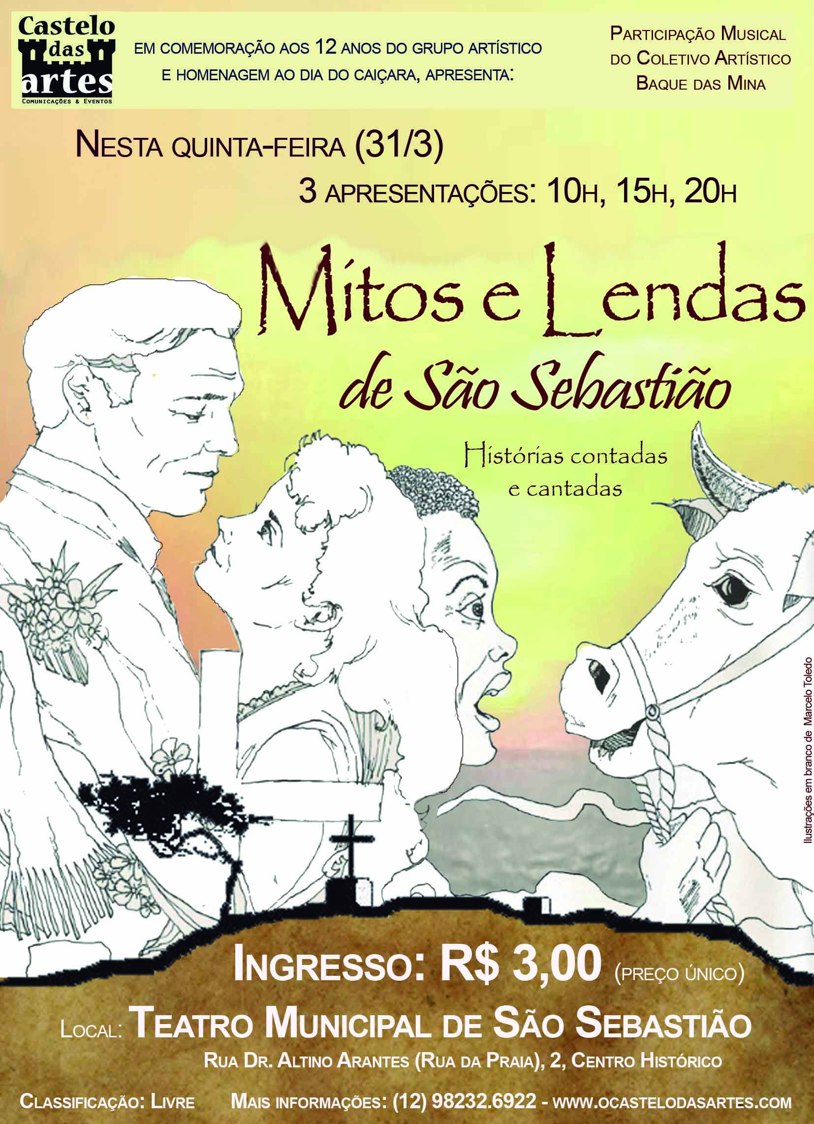 O grupo Castelo das Artes apresenta a peça Mitos e Lendas de São Sebastião, nesta quinta-feira (31), às 10h, 15h e 20h, no Teatro Municipal de São Sebastião. As histórias contadas e cantadas têm classificação livre. Segundo os produtores, o ingresso tem o preço único de R$ 3 com o objetivo de incentivar a formação de público e facilitar o acesso a arte e cultura.