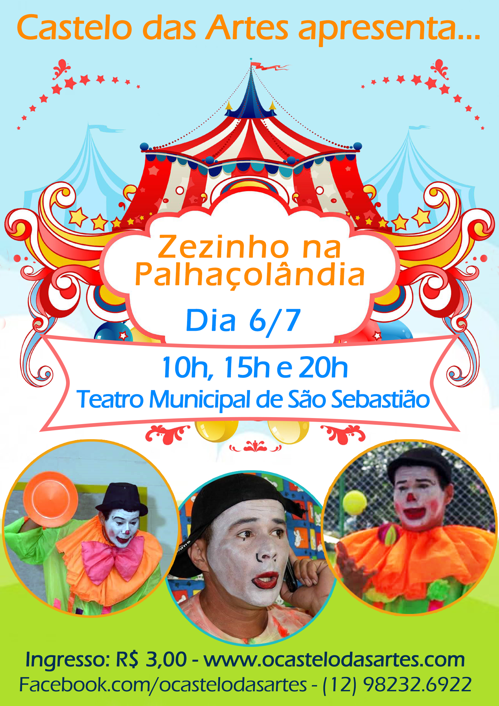 Com o objetivo de que as crianças não tenham medo de palhaços e se divirtam com a arte circense, o Castelo das Artes traz a peça Zezinho na Palhaçolândia. A encenação infantil estará no palco do Teatro Municipal de São Sebastião, na próxima quarta-feira (6), em três horários, 10h, 15h e 20h, pelo projeto Teatro Popular Adoçando Sua Vida com ingresso a R$ 3,00.