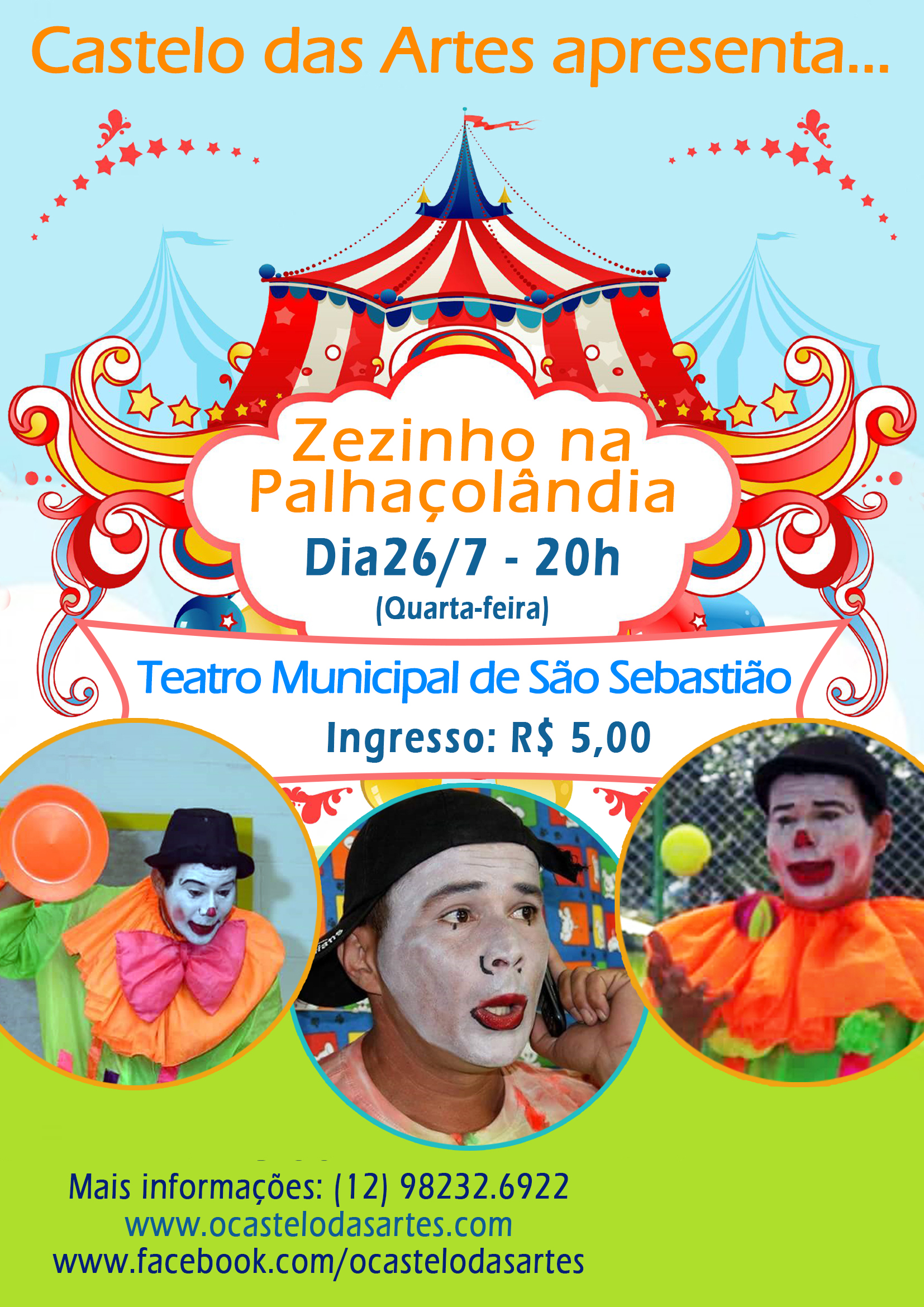 Para que as crianças possam aproveitar as palhaçadas dos palhaços sem medo e se divirtam sempre com a arte circense, o Castelo das Artes traz a peça “Zezinho na Palhaçolândia”. A encenação infantil estará no palco do Teatro Municipal de São Sebastião na quarta-feira (26), às 20h, com ingresso a preço popular de R$ 5,00.