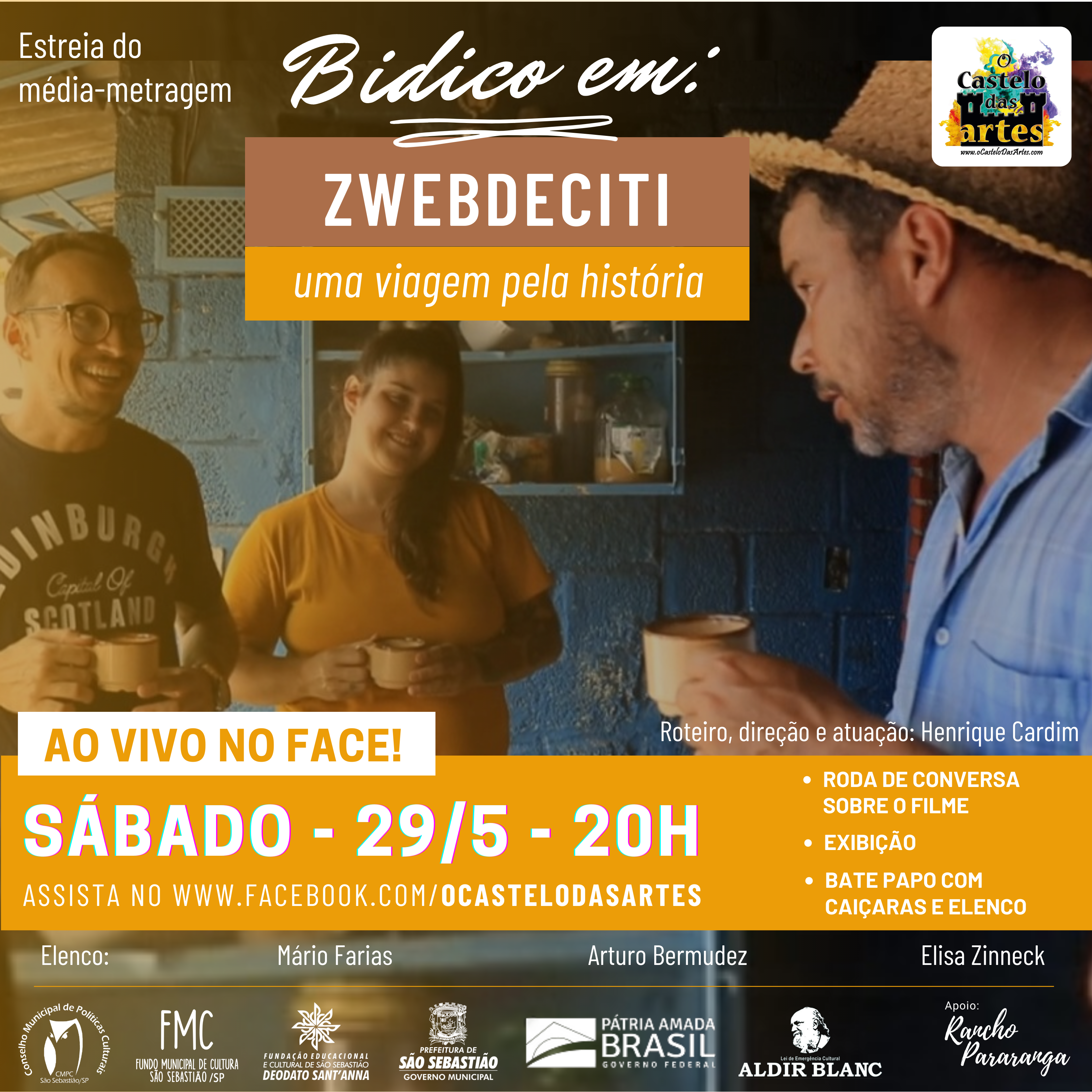 Neste sábado, 29 de maio, ao vivo no Facebook da Cia. O Castelo das Artes, TRASMISSÃO DO NOSSO PRIMEIRO MÉDIA-METRAGEM “Bidico em: Zwebdeciti – uma viagem pela história”. Antes da transmissão teremos uma roda de conversa sobre os desafios de iniciar uma produção audiovisual e após o filme um bate-papo com caiçaras e elenco sobre a importância de registrar, contar e valorizar nossas histórias e tradições.
