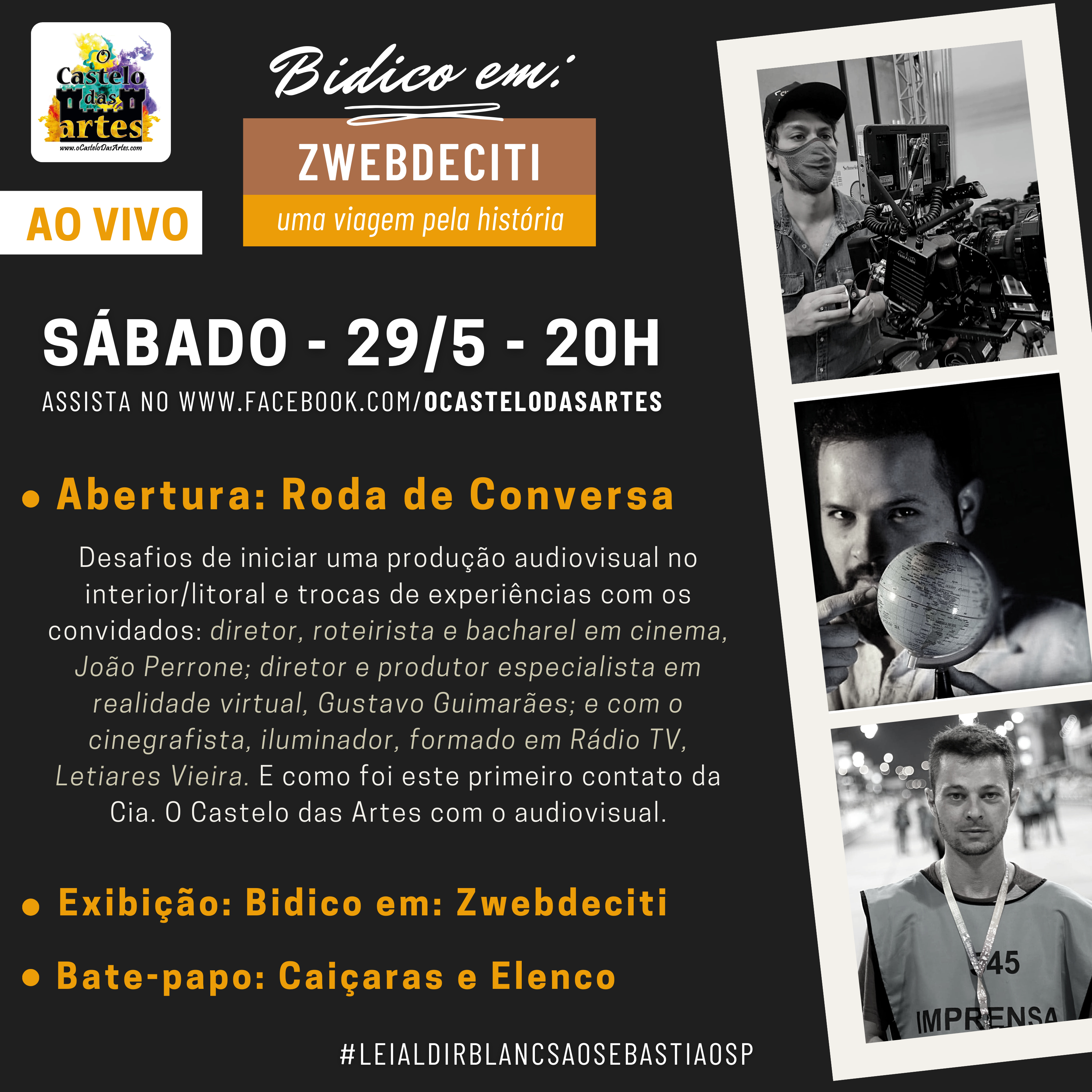 Quer saber mais sobre como vai ser a Roda de Conversar amanhã (29/5), antes da exibição do “Bidico em: Zwebdeciti – uma viagem pela história”? Confere na imagem abaixo! Estamos animados para a transmissão! Vem junto com a gente acompanhar. Coloca na agenda que é ao vivo, às 20h, pelo Facebook da Cia. O Castelo das Artes!