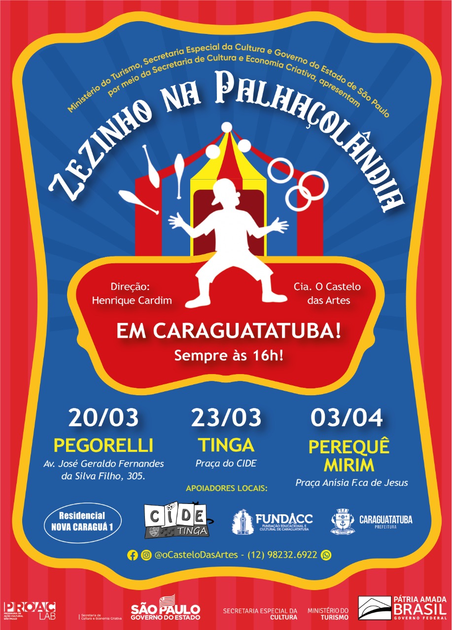 No próximo domingo (20/3), às 16h, a circulação do espetáculo “Zezinho na Palhaçolândia” chega em Caraguatatuba, no bairro Pegorelli, na Av. José Geraldo Fernandes da Silva Filho, 305, Residencial Nova Caraguá 1. A apresentação, que foi sucesso de público em São Sebastião, é realizada pelo diretor, dramaturgo, ator e palhaço Henrique Cardim, pelo Prêmio por Histórico de Realização em Teatro do Programa de Ação Cultural (ProAC), do Governo do Estado de São Paulo, por meio da Secretaria de Cultura e Economia Criativa.