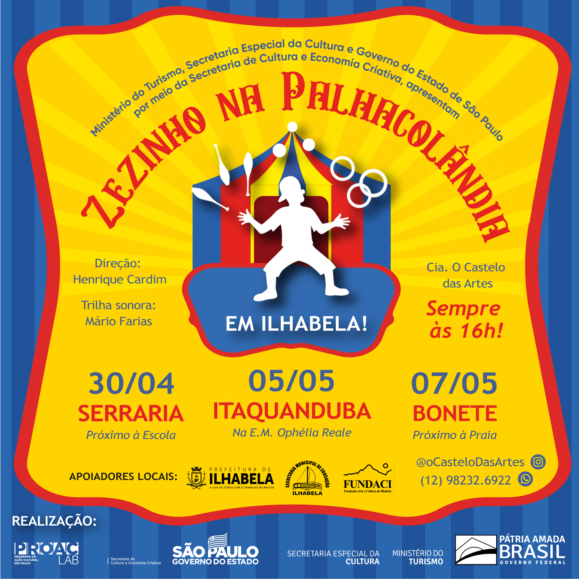 A circulação do “Zezinho na Palhaçolândia” pelo litoral norte paulista desembarca em Ilhabela, com primeira apresentação na comunidade tradicional da Serraria, no próximo sábado (30/4), às 16h, próximo a escola. Além de chegar ao local que é acessível por barcos, a Cia. O Castelo das Artes também estará no dia 5 de maio (quinta-feira) no bairro Itaquanduba, na escola municipal Profª Ophélia Reale Montanhesi, e no dia 7 de maio (sábado), na comunidade tradicional do Bonete. O espetáculo foi sucesso de público em São Sebastião e Caraguatatuba e, segundo os artistas caiçaras, agora também está sendo a realização de um sonho de ter condições de chegar nestes territórios mais isolados.