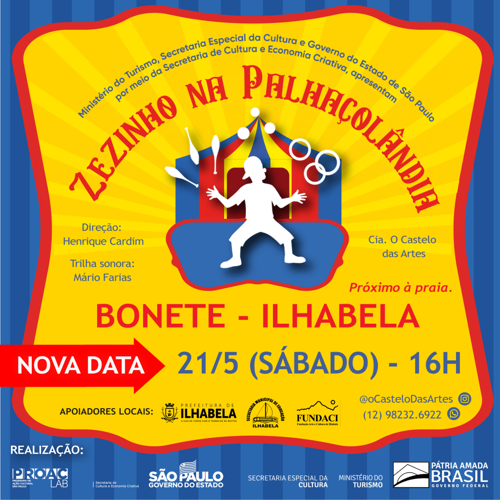 Devido aos alertas emitidos pela Marinha e pela Defesa Civil do Estado de São Paulo, bem como dos municípios de São Sebastião e Ilhabela, sobre as condições climáticas e do mar neste final de semana, a apresentação do espetáculo Zezinho na Palhaçolândia, que estava agendada para ser realizada neste sábado (7/5), no Bonete, comunidade tradicional de Ilhabela, foi transferida para o dia 21 de maio (sábado), às 16h, no mesmo local.