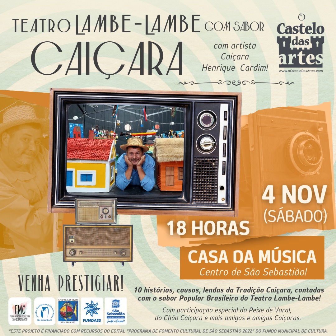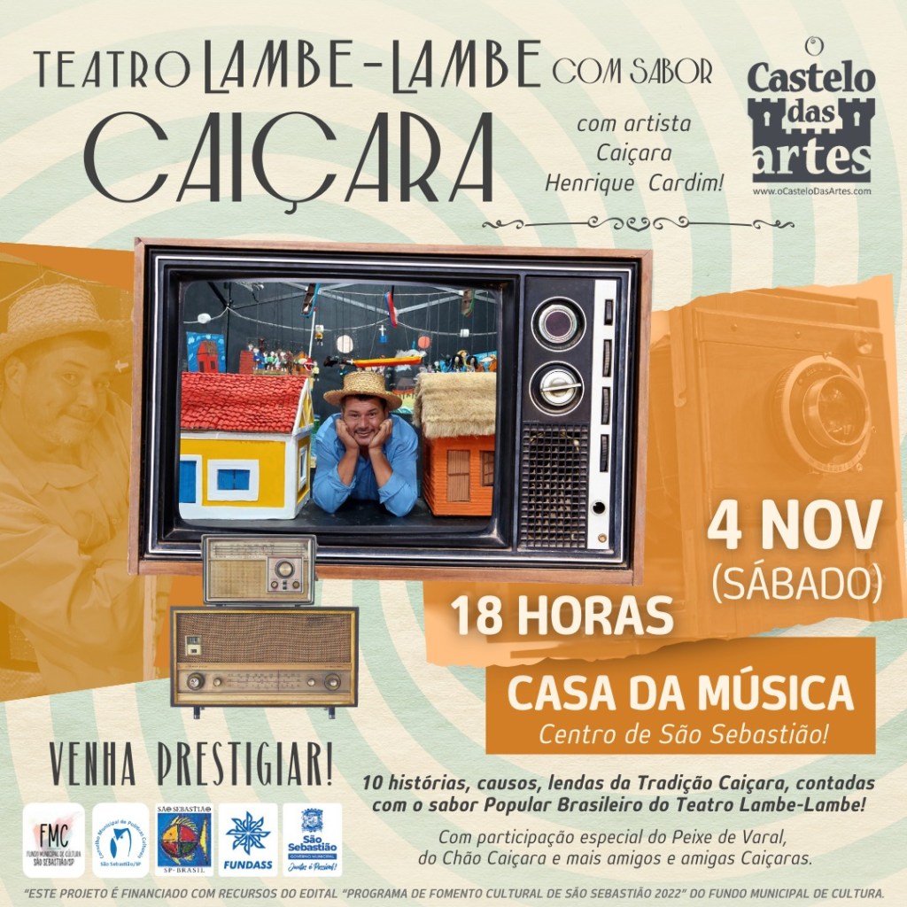 A apresentação “Teatro Lambe-Lambe com sabor Caiçara” é produzida com recursos do Edital 02/2022 – “Programa de Fomento Cultural de São Sebastião do Fundo Municipal de Cultura” e traz uma forma inusitada de contar as histórias dos povos do mar e direcionar o olhar do público às tradições de uma forma envolvente, leve e dinâmica. O Projeto contou com orientação do artista de São Paulo, especialista nesta técnica teatral, Gustavo Guimarães, do grupo Ciclistas Bonequeiros. Dentre os artistas Caiçaras, além de Henrique Cardim, também temos Jessyca Biazini na Comunicação, Pamela dos Santos, na contrarregragem e Rodrigo Pupo, na produção técnica da sonoplastia. Além de Agnes Roberta, como assistente de produção, e Larissa Ferraz, no apoio da identidade visual da circulação.