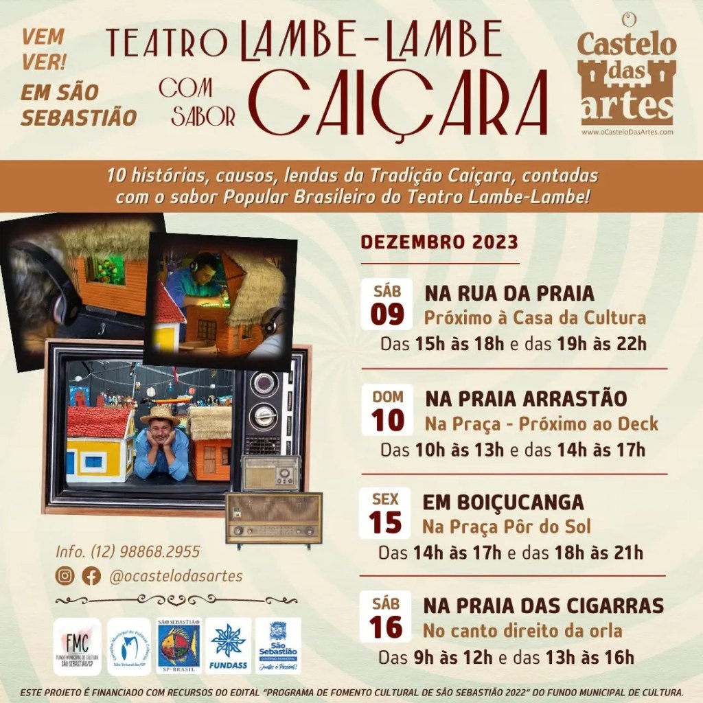 As pessoas que estiverem na Rua da Praia, no Centro de São Sebastião, entre 15h e 22h deste sábado (9/12), e na Praia do Arrastão, entre 10h e 17h de domingo (10/12), poderão apreciar e escolher entre 10 histórias, causos e lendas, contadas com a técnica cênica popularmente brasileira. Este é o Projeto “Teatro Lambe-Lambe com sabor Caiçara” que traz oito apresentações neste mês de dezembro contemplando também a Praça Pôr do Sol, em Boiçucanga, na Costa Sul, entre 14h e 21h do dia 15 (sexta-feira), e a Praia da Cigarras, na Costa Norte, entre 9h e 16h do dia 16 (sábado).