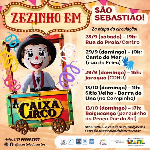 “Zezinho em: A Caixa-Circo” segue em circulação a partir do próximo final de semana e estará no sábado (28/9), às 19h, na Rua da Praia (em frente à Casa da Cultura), no domingo (29/9), às 10h no Canto do Mar, na rua da feira em frente a EM Cynthia Cliquet Luciano, e às 16h, no CDHU do Jaraguá. Já no dia 13 de outubro (domingo), serão duas apresentações, sendo às 11h no bairro Sítio Velho, em Barra do Una, e às 17h, no parquinho da Praça Pôr do Sol, em Boiçucanga.