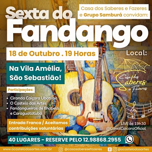 O Grupo de Fandango Samburá vai receber o Grupo Ciranda Caiçara de Ubatuba e fandangueiros de Caraguatatuba e Ilhabela para confraternizar com muita música, dança e cultura Caiçara.