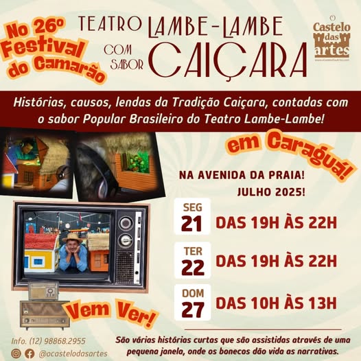 No 26º Festival do Camarão, em Caraguá, o público vai poder assistir a histórias curtas e emocionantes da tradição caiçara, contadas por bonecos em uma experiência intimista e única: tudo acontece dentro de uma pequena caixa-cenário, onde o espetáculo é visto por uma janela mágica. ![]()