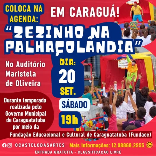 No próximo sábado, dia 20 de setembro, às 19h, o Auditório Maristela de Oliveira recebe o espetáculo “Zezinho na Palhaçolândia”, uma produção do Ponto de Cultura O Castelo das Artes.