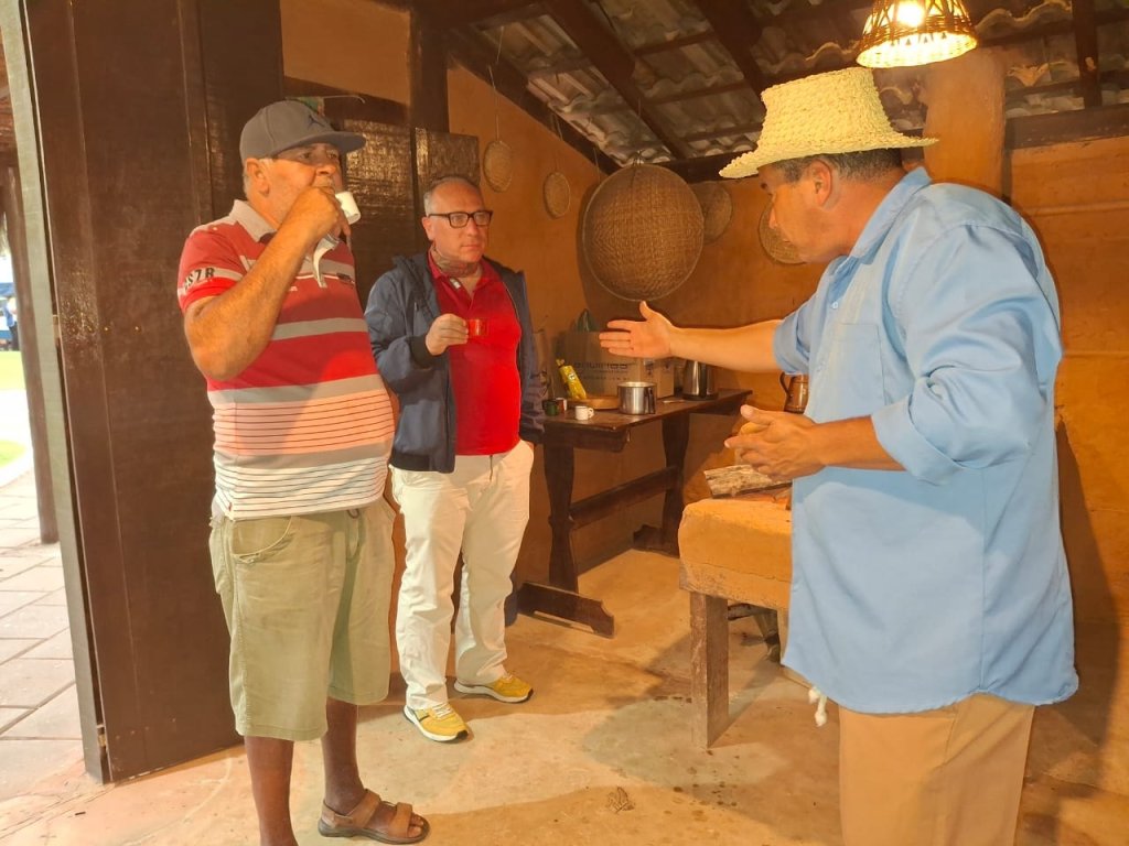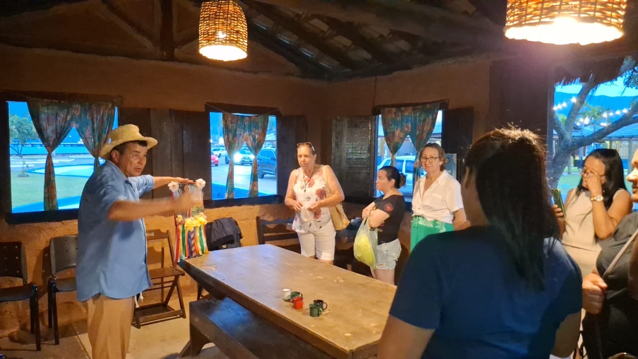 A noite contou com a participação de Nicinho, do Chão Caiçara, que contribuiu para a atmosfera acolhedora do encontro com o tradicional café de garopa e bananas assadas no fogão a lenha, elementos que evocam memória, afeto e identidade cultural.
