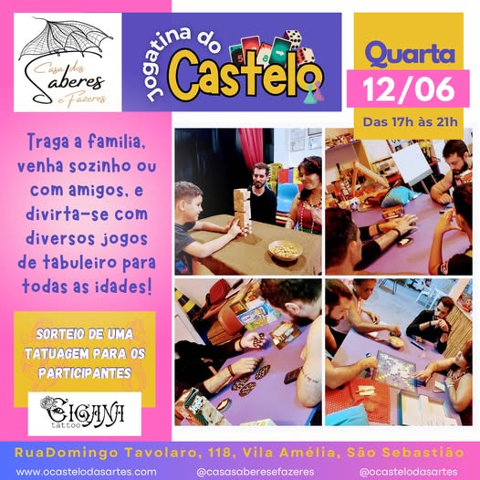Mais Maisss uma Jogatina do Castelo! Desta vez na quarta-feira (12/6), das 17h às 21h! Na Casa dos Saberes e Fazeres, na Vila Amélia, em São Sebastião Vamos fazer uma vivência com jogos de tabuleiro... teremos jogos para todas as idades... venha com a família... venha com os amigos... venha sozinho... mas venha e seContinuar lendo "Mais uma Jogatina do Castelo! Desta vez na quarta-feira (12/6)"