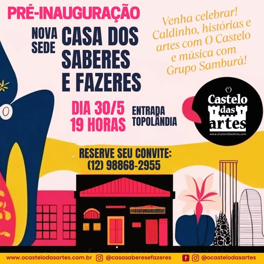 Pré-inauguração da nova sede da Casa dos Saberes e Fazeres, sede do Ponto de Cultura O Castelo das Artes! Noite especial, com caldinho, bolo, cafezinho... Histórias e artes com O Castelo das Artes e música com Grupo Samburá. E microfone aberto aos amigos artistas que queiram participar. Dia 30 de maio (sexta-feira) A partir dasContinuar lendo "Pré-inauguração da nova sede da Casa dos Saberes e Fazeres, sede do Ponto de Cultura O Castelo das Artes!"