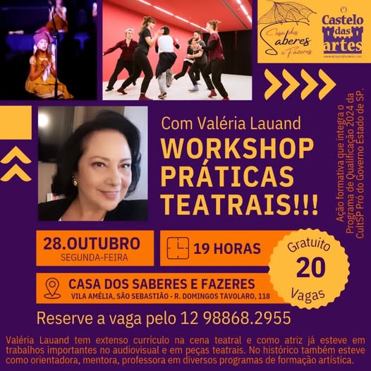 Participe! _*28/10 (segunda), 19h, na Casa dos Saberes e Fazeres (Vila Amélia - rua atrás das Casas Bahia) - Workshop de Práticas Teatrais com Valéria Lauand*_, por meio do Programa de Qualificação Teatro do CultSP Pró, do Governo do Estado de SP. Valéria Lauand em São Paulo tem extenso currículo na cena teatral e comoContinuar lendo "Workshop de Práticas Teatrais com Valéria Lauand"