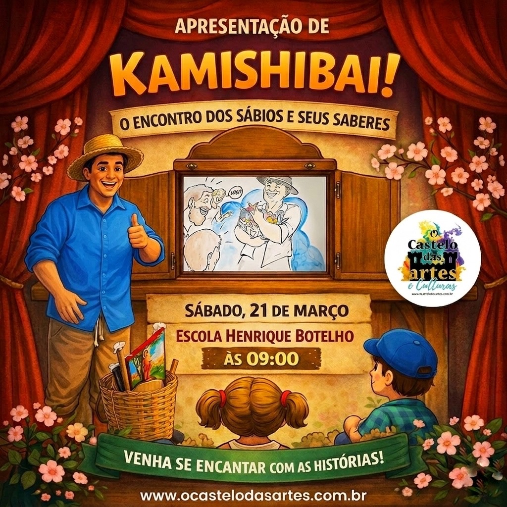 Na manhã deste sábado, 21 de março, ira começar com arte e tradição! Às 9h, o Ponto de Cultura O Castelo das Artes estará na Escola Henrique Botelho levando o espetáculo de Kamishibai – O Encontro dos Sábios e Seus Sabere
